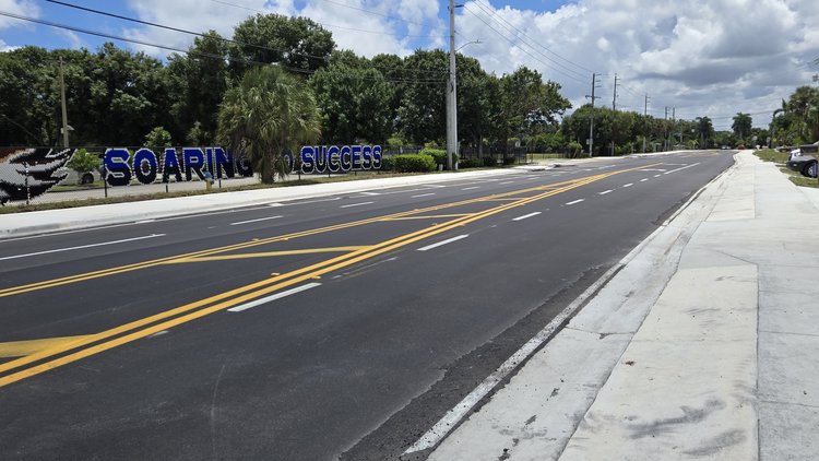 Project improvements include milling and resurfacing the existing roadway, drainage improvements, constructing a ten-foot shared-use path on the west side of the roadway and a 6-foot sidewalk on the east side, installation of midblock pedestrian crossing and school zone flashers, street lighting infrastructure, and irrigation.